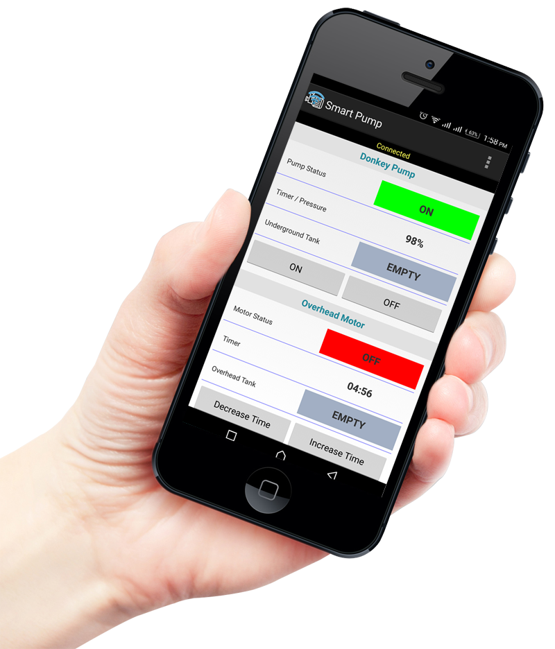 Smart Pump manages incoming water supply, water pump, underground tank storage, overhead tank motor and overhead tank storage for you. Using this technology you don't have to worry about checking incoming water, underground tank or overhead tank for water overflow anymore.
